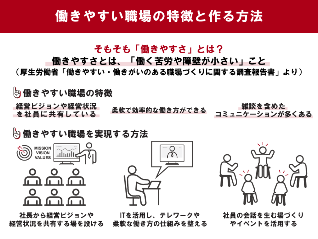 働きやすさを実現するためには、まず従業員のニーズを理解する必要があります。柔軟な働き方や健康的で安全な職場環境の提供は、従業員のウェルビーイングを高めるために重要です。また、オープンなコミュニケーションを促進することで、従業員同士の関係を良好にし、チームワークを高めることができます。
