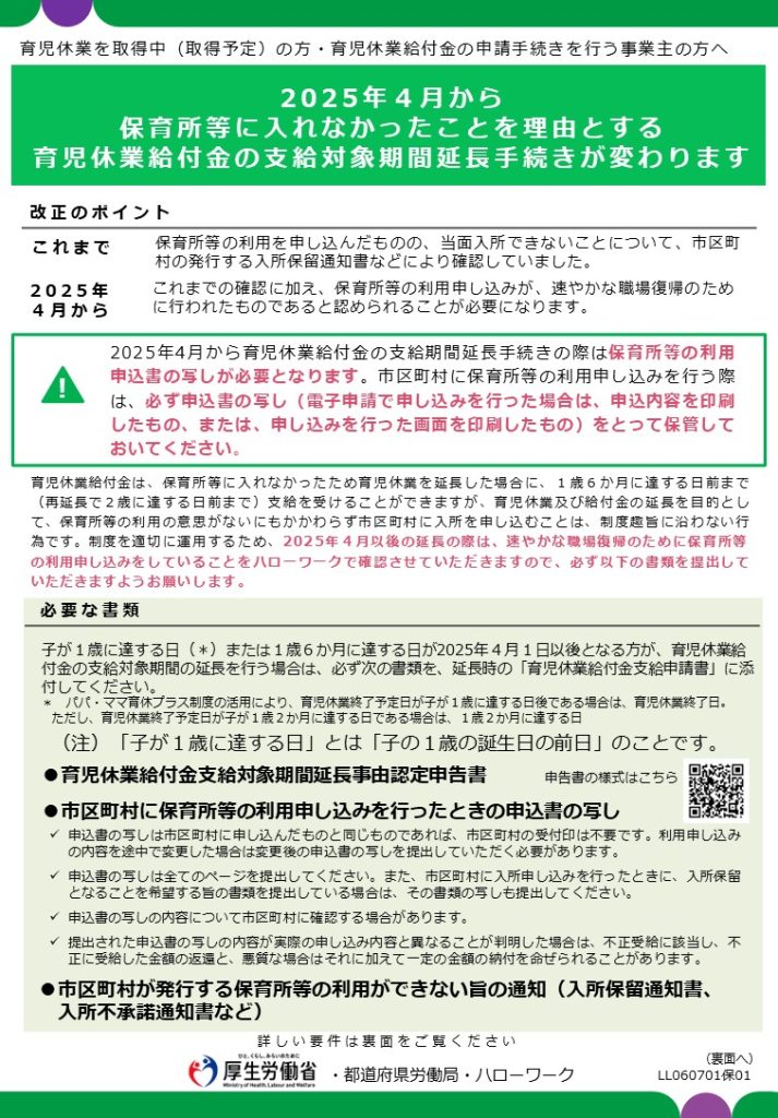 育児休業の延長のメリットとしては、子どもの健康状態や育児の状況に応じて、仕事の復帰時期を調整できることが挙げられます。また、雇用保険から給付金を受け取ることができるため、経済的な負担を軽減することができます。育児休業の延長を申請する際には、事前に必要な書類や手続きを確認しておくことが重要です。手続きを適切に行うことで、スムーズに給付金を受け取ることができます。